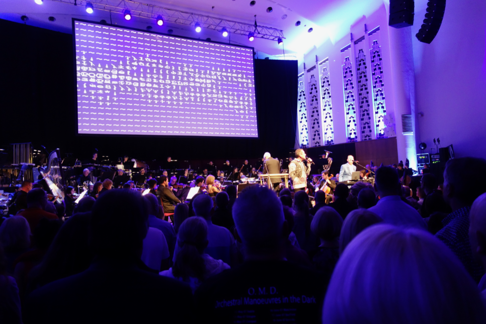 While the choice of ‘Stanlow’ to open the performance might seem a little unusual by OMD standards (it was traditionally the song that OMD concerts closed with), there’s something suitably majestic about the composition that lends itself equally to acting as an overture of sorts. Stunning drone footage of the oil refinery from which the song takes its name is projected behind the orchestra. Meanwhile, Andy McCluskey and Paul Humphreys appear composed and thoughtful as the opening bars unfold. The composition seems to take on a hymnal quality with a judicious use of strings before building to a busy collage of sound. A huge round of applause erupts as the familiar rhythmic pumping brings the arrangement to a close. “All the hits are in the second half” Andy offers dryly.